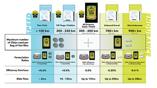 EnduranceChip. EnduranceChip is the best option for ultra-endurance events or training chains to get the most longevity out of your components. EnduranceChip is a semi-synthetic wax blend boasting some of the longest molecular chain lengths possible in a wax for ultimate durability. Adding EnduranceChip to SecretBlend can permanent increase the distance between re-waxing by as much as 2.5X (up to 750km) while still being as fast as the top wet lubricants and significantly faster than any dry lubricant. Add a second chip for even further single application longevity.
